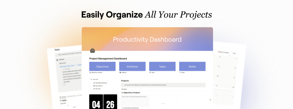 This Notion Productivity Dashboard helps you to organize your projects and tasks using Google's OKRs method. Break your projects down into initiatives and tasks to keep all of your work organized while keeping your eye on your goal. Designed and created by YouTuber and Tech Marketer, Angel Zheng.